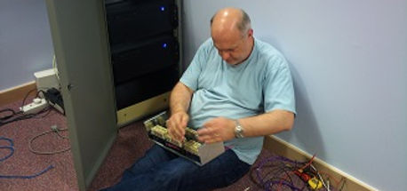 Graeme starts wiring the rack. The rack holds the pc's for the music library, the automated service, and log recordings